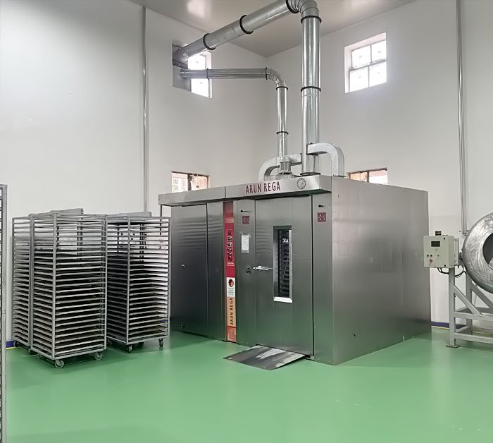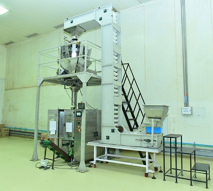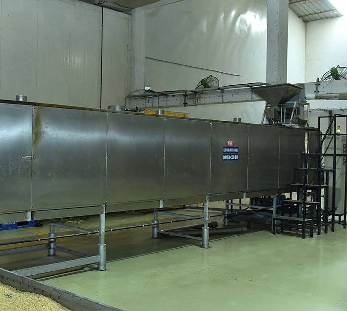 We have hot air conventional dryer installed Flaker that has the capacity to dry 500kg of extruder snacks per hour. It is in built with advanced temperature control system which help us to maintain the temperature in all the 5 stages unanimously. The unique hot air circulation method help us to give smooth bite & crunchy product without any discoloration in the finished products.